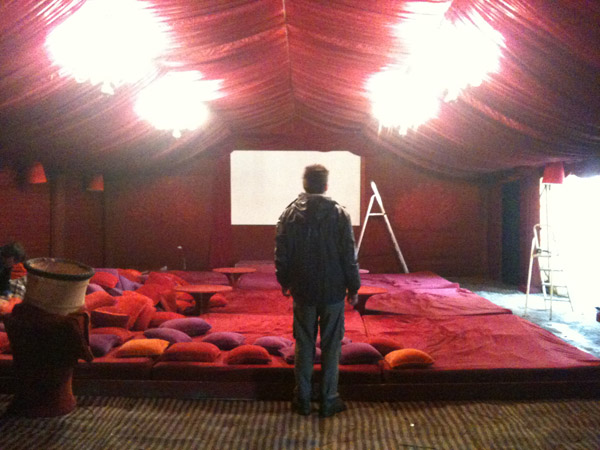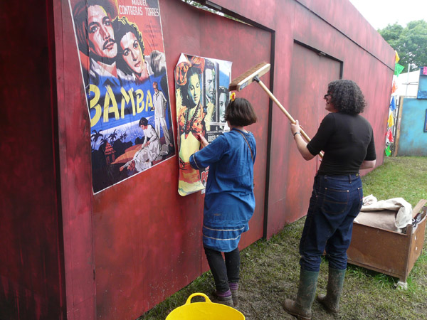 We are putting the finishing touches to The Lost Picture Show at Glastonbury, ready to open at 8pm tonight. The crew have had a very busy couple of days, made more hectic by the fact that we have had this enormous but incredible new frontage to construct, but despite heavy downpours of rain everything has gone swimmingly (for want of a better word!). We even had a special visit from a certain someone which we were all buzzing about – see photo below! The rest of the field looks fantastic as well, with a Bullring made out of old canal locks, Bassline Circus, the Wall of Death and lots of other weird and wonderful curiosities. Those festival people out there are in for a big indulgent treat!